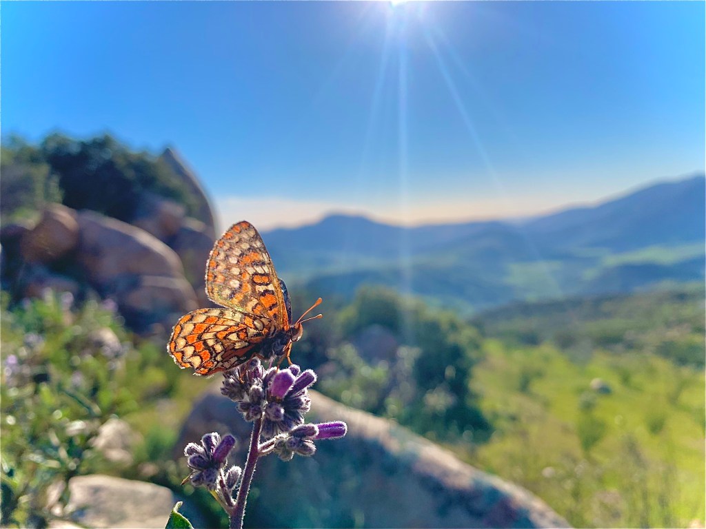 Edith’s Checkerspot (Euphydryas editha)is a particularly charismatic butterfly that occurs in colonies throughout much of southwestern North America, from southern British Columbia, Canada to northern Baja California, Mexico. Most E. editha populations are dependent on single species of host plants in their larval stage (e.g., Antirrhinum, Collinsia, Orthocarpus, and Plantago spp.). However, these host associations can evolve quickly; single populations can achieve complete host shifts in around 20 generations. This process of rapid adaptation has produced at least six distinct ecotypes of E. editha in California, each locally adapted to its host and habitat different ways. These habitats are unusually diverse for a single species, distributed from sea level to over 4,000 m elevation. Two Californian subspecies are federally endangered: E. e. bayensis, occurring in the Bay Area, and E. e. quino, occurring in Riverside/San Diego Counties and northern Baja California. Population declines over the past century have been linked to urban and agricultural development, competitive exclusion of host plants, increases in fire frequency, and a warming, drying climate.